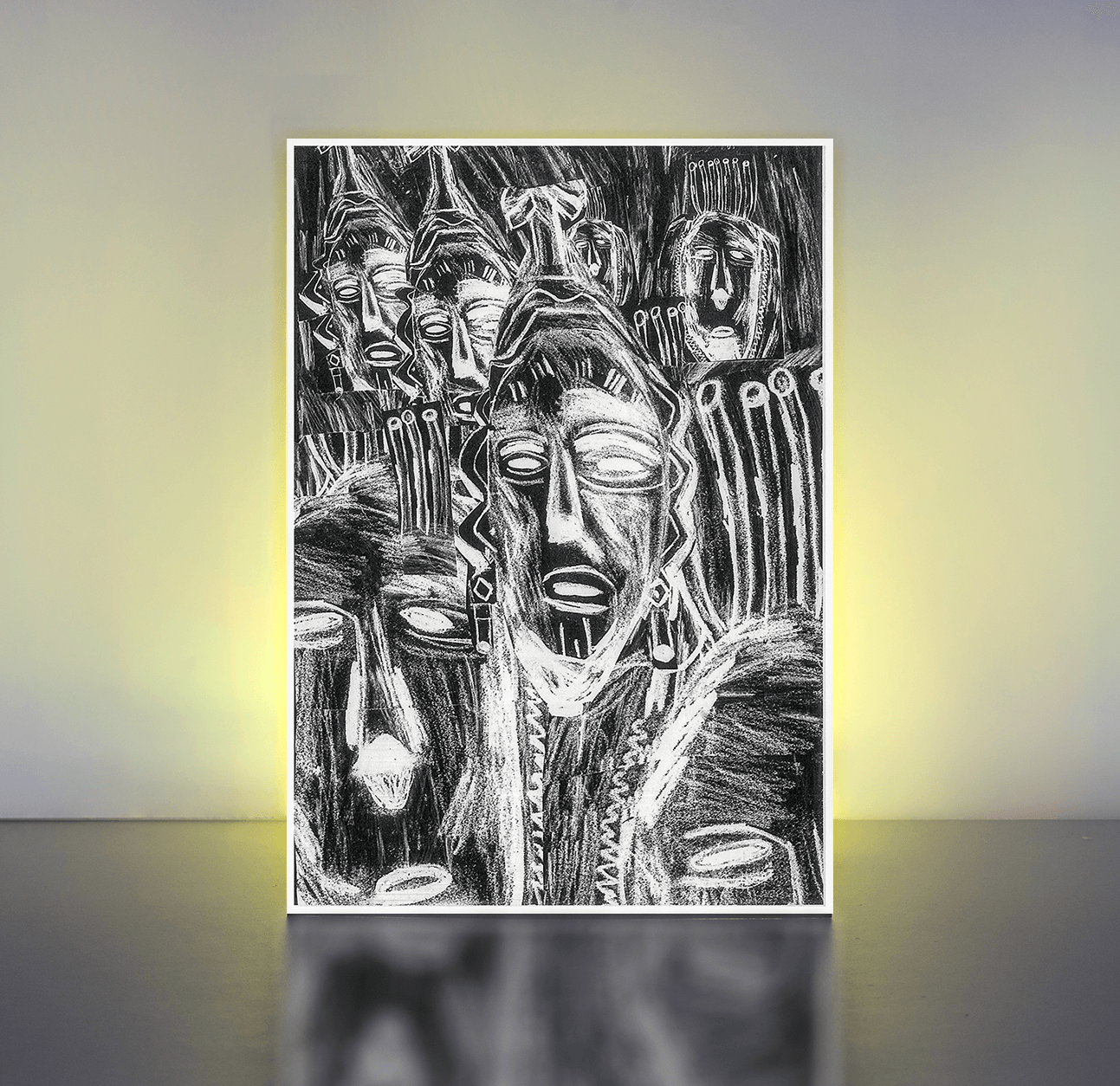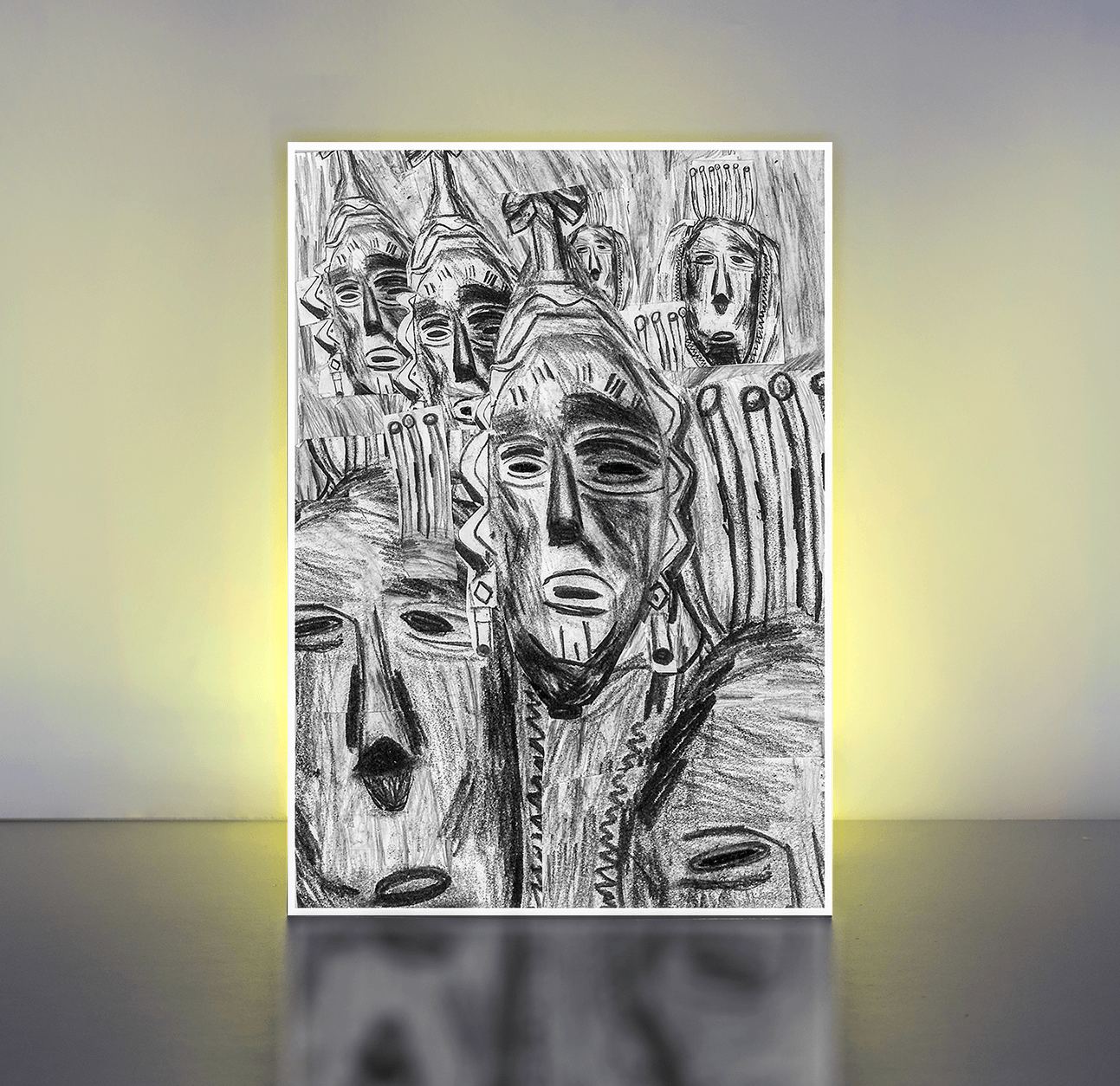 Dieses gezeichnete Bild zeigt das Reich der afrikanischen Masken. Herangezoomt, weggezoomt und Perspektive. Dozent: Nadine Krola Jahr: 2018 Format: A4 Medium: kein spezifischer Einsatz